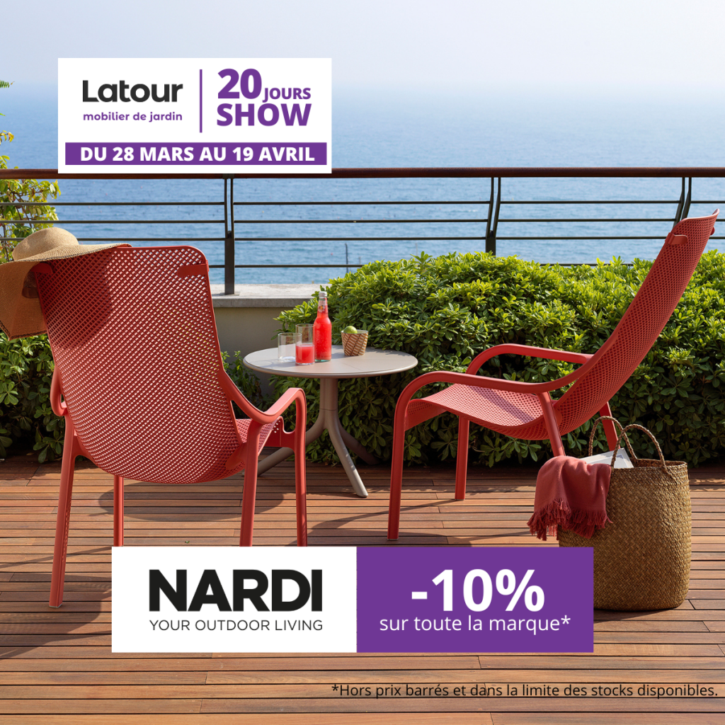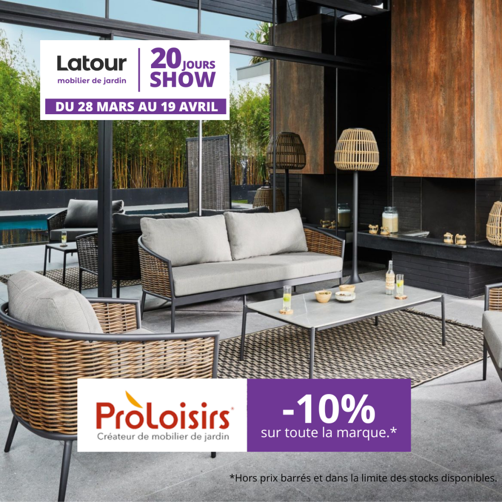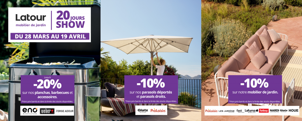 Du 28 mars au 19 avril 2026, profitez de notre opération exclusive Les 20 Jours Show. Équipez vos espaces extérieurs avec les plus grandes marques de mobilier et de cuisson à des prix privilégiés.