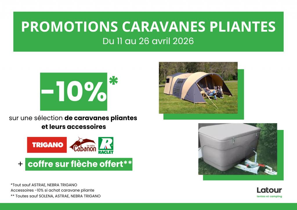 - -10 %* sur une sélection de caravanes pliantes et leurs accessoires TRIGANO, CABANON, RACLET.